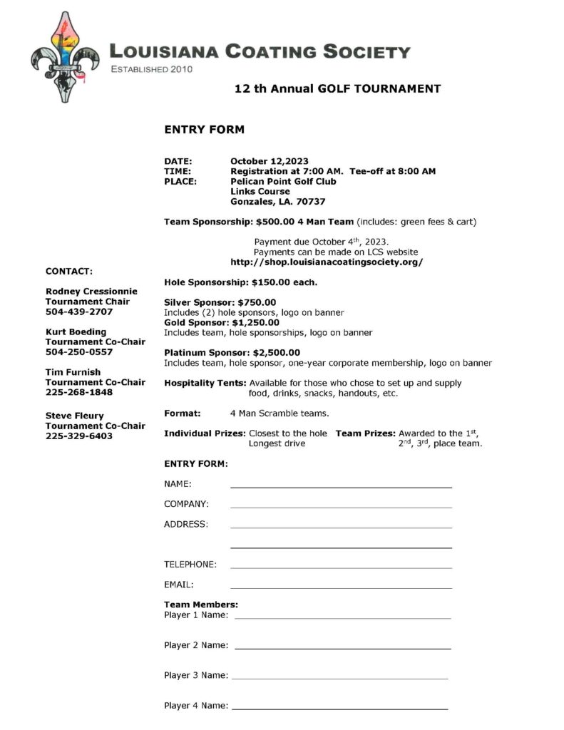 Time to register for the Louisiana Coating Society’s Annual Golf Tournament!!