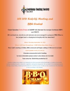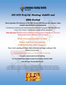 Due to the disruption created by hurricane Ida, we have decided to postpone the 2021 LCS Kickoff Meeting and BBQ Contest. The Louisiana Coating Society’s