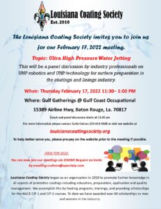 Please join us on February 17, 2022 for our monthly meeting. We will be hosting a panel discussion on Ultra High Pressure Water Jetting. You