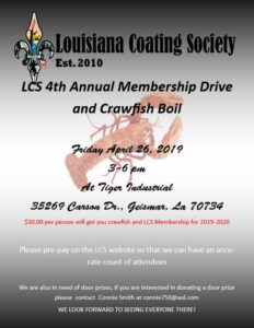 On February 21st your Louisiana Coating Society will be holding our first meeting of 2019. We’ll be meeting at 11:30 in Cabela’s for a lunch